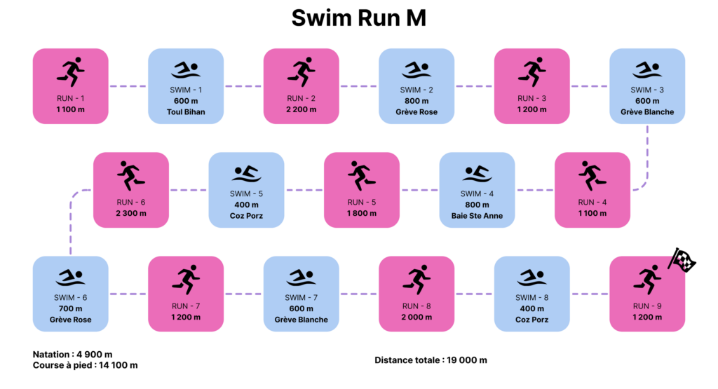 Sur le SwimRun M (19 km), l’épreuve de natation est divisée en 8 tronçons pour un total d’environ 4900 m. L’épreuve de course à pied est divisée en 9 tronçons pour un total d’environ 14.1 km.